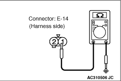 - Resistance between E-14 licence plate lamp (LH) connector terminal No.1 and body earth