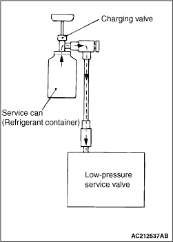 Tighten the handle of the adaptor valve (valve open) to charge the required volume of refrigerant. 25.After charging with refrigerant, turn the handle of the adaptor valve back all the way (valve closed). 26.Tighten the charging valve handle (valve closed). Remove the quick joint (for low-pressure) from the low-pressure service valve. 27.Remove the service can.