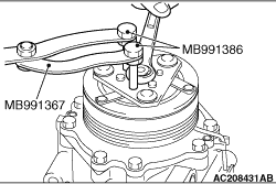 • Be sure to use the guide (MB992625) when the side bearing puller (MB990810) is used to prevent the damage of A/C compressor.