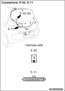 (1)Disconnect the connector, and measure at the wiring harness side. (2)Turn the ignition switch to the "ON" position. (3)Turn the rear window defogger switch to the "ON" position.