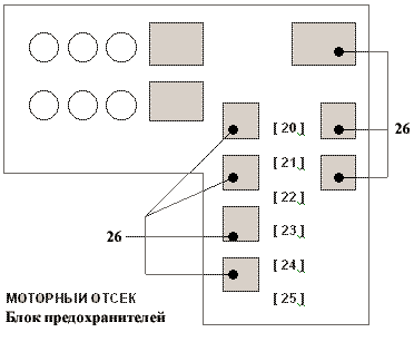 водителем под панелью приборов слева. В моторном отесеке блок