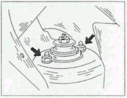 14.1.2. СНЯТИЕ И УСТАНОВКА СТОЕК АМОРТИЗАТОРОВ.• Заднюю часть автомобиля установите на козлы и снимите оба задних колеса для получения доступа к пружинам амотизаторов. • Подставте домкрат под середину заднего моста (см.рис.215) и поднимате последний до тех пор пока не увидите, что амортизаторы сжались. • Для получения доступа к верхней части крепления амортизатора (крепление стойки амортизатора) снимите обшивку изнутри багажника. Удалите колпачок, расположенный над стойкой амотизатора, и две гайки, изображенные на рис.216.