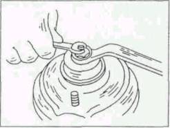 • Разборка стойки амортизатора выполняется следующим образом: • Установите пружинное зажимное приспособление на витки пружины, как изображено на рис. 205, и сожмите пружину, чтобы вынуть ее вверху и внизу из седла. Если у вас нет такого пружинного зажимного приспособления, можно использовать два пружинных крючка со стяжным замком посередине. В этом случае затяните стяжные замки обоих крючков таким образом, чтобы пружина поднялась из седла и находилась в середине в ослабленном виде. • Законтрите шток поршня с помощью гаечного ключа с открытыми зевами (см. рис 218) и ослабьте гайку штока поршня с помощью кольцевого ключа.