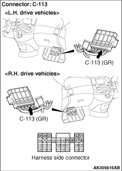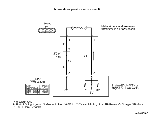 Check and repair harness between B-106 (terminal No. 1) air flow sensor connector and C-113 (terminal No. 99) engine-ECU <M/T> connector or engine-A/T-ECU <A/T> connector.