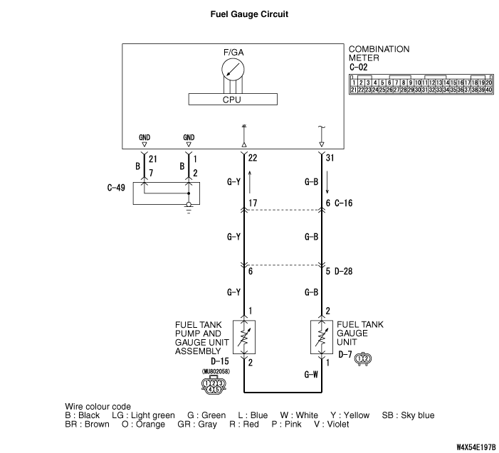If only the fuel gauge does not operate, the fuel tank pump and gauge unit assembly, fuel tank gauge unit, combination meter, wiring harness or connector(s) may be defective.