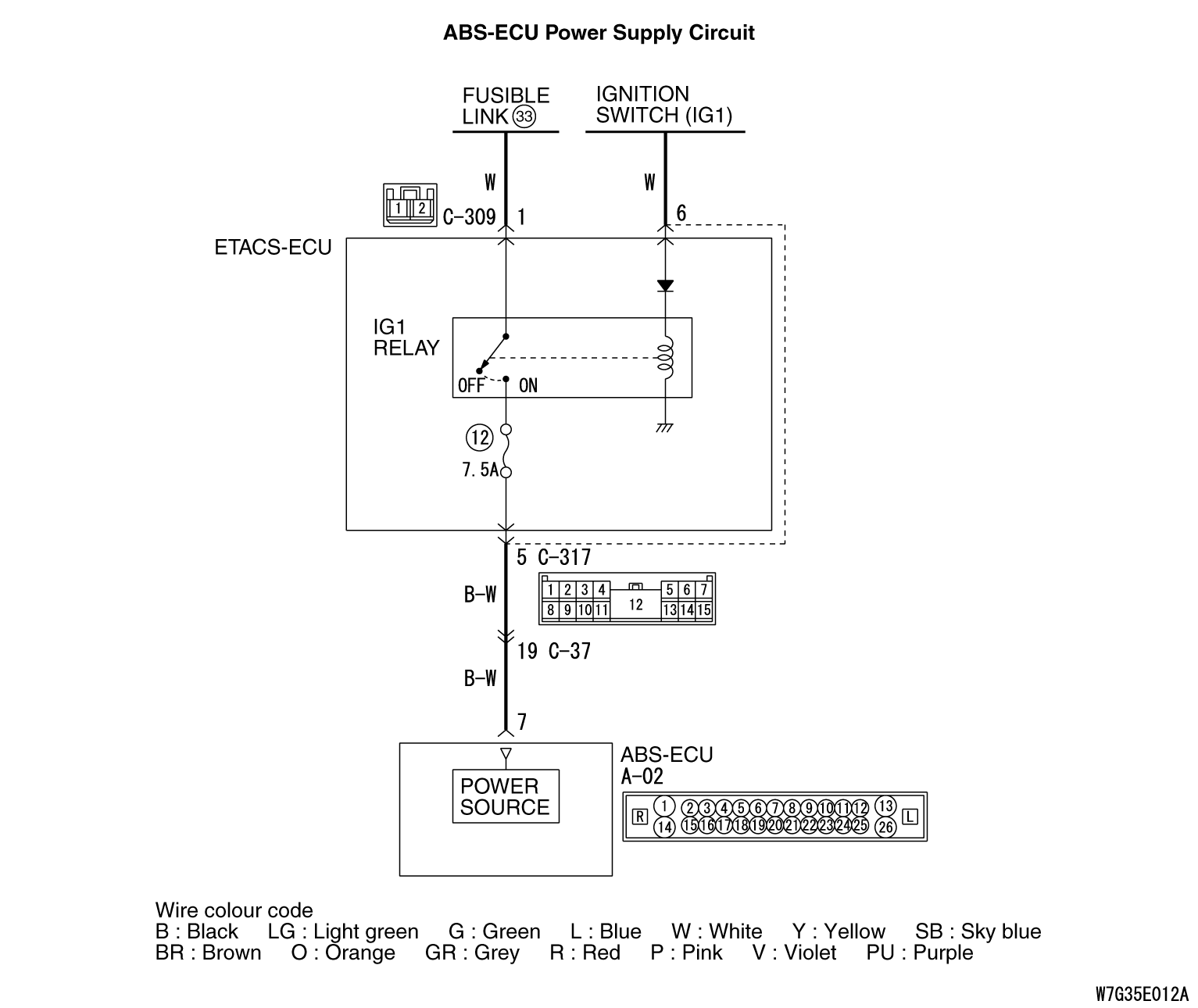 wiring harness between the A-02 ABS-ECU connector terminal No. 7 and the fusible link No. 33.
