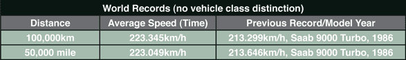 The last driver for the No. 1 took the wheel at 8:28, with 180km remaining, followed by the No. 3 at 9:00 with 380km left. The No. 1 car broke the old 100,000km world record at 9:15:26 with an average speed of 220.358km/h (136.924 mph). The other two cars rejoined the No. 3 car on the course as it drove its last laps. The No. 3 car finished at 10:42:43, still breaking the Saab world record with 219.664km/h (136.493 mph).