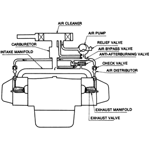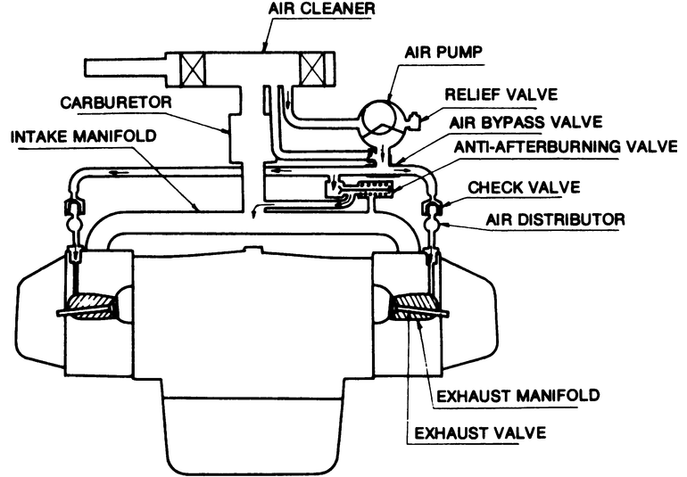 A belt driven air pump is used to supply air, under pressure, to air distribution manifolds which have openings at each exhaust port. Injection of air at this point causes combustion of the unburned hydrocarbons in the exhaust manifolds, rather than allowing them to escape into the atmosphere. An anti-backfire valve controls the flow of air from the pump to prevent backfiring which results from an overly rich mixture under closed throttle conditions.