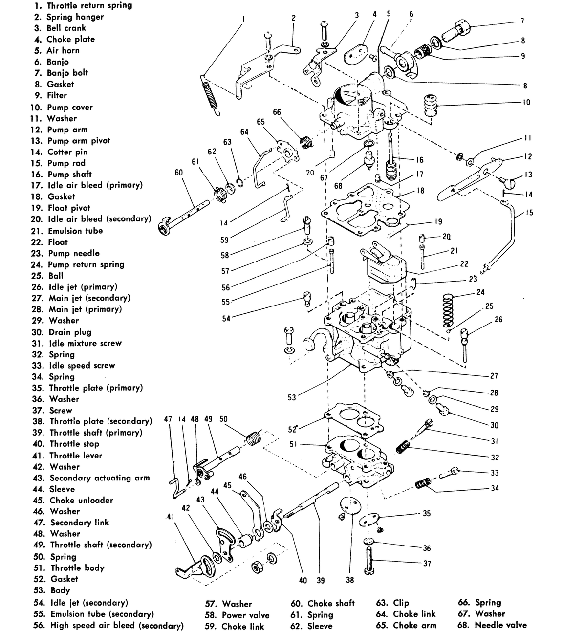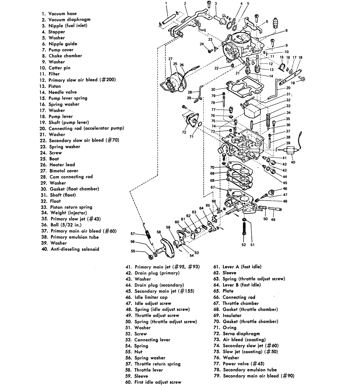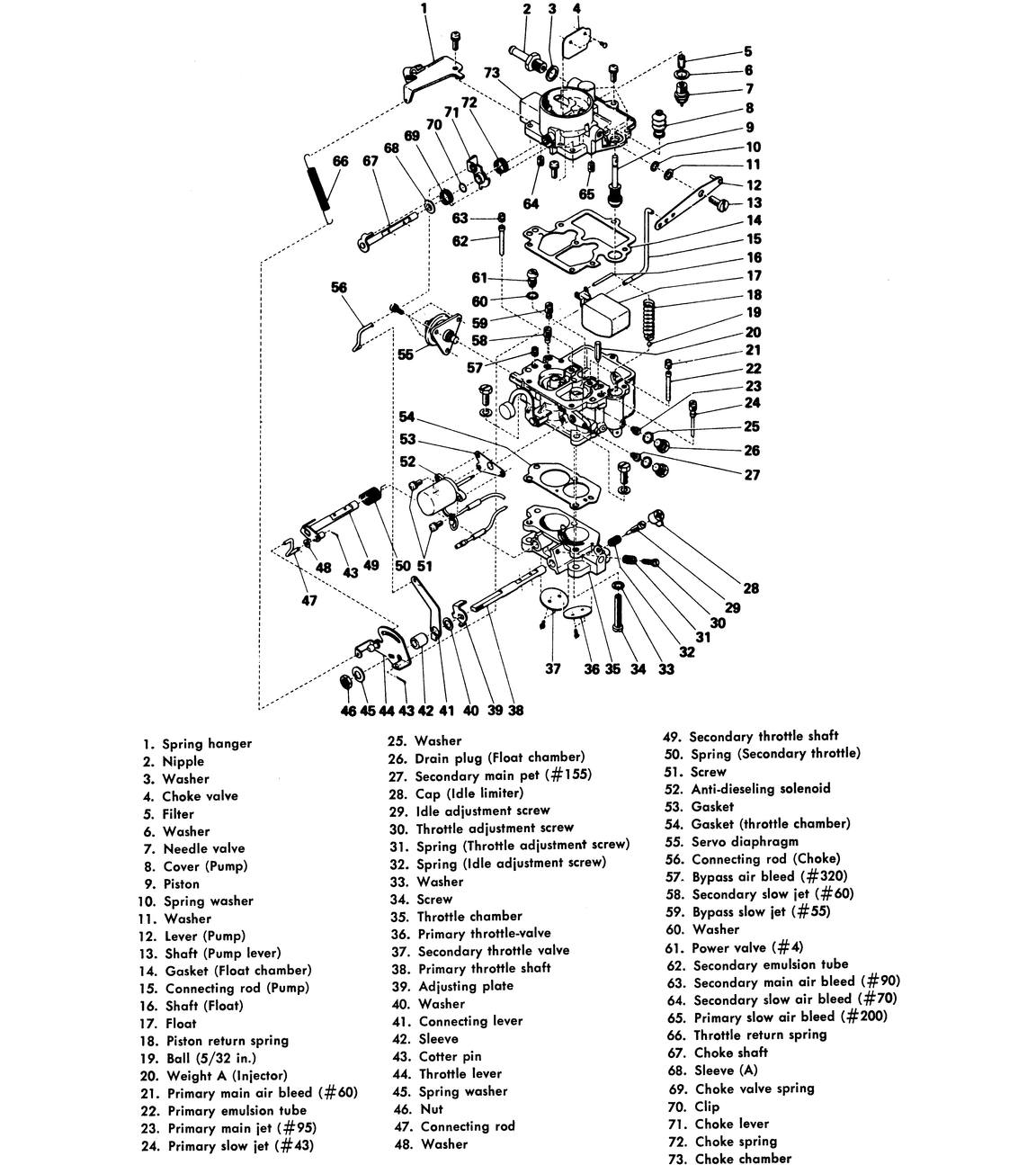 | Fig. 2: Exploded view 1972–73 GL and DL carburetor |