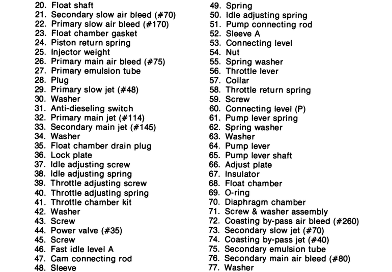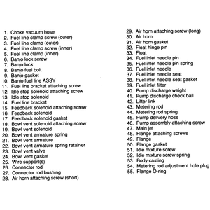 | Fig. 9: Components, 1983–84 Hitachi carburetor |