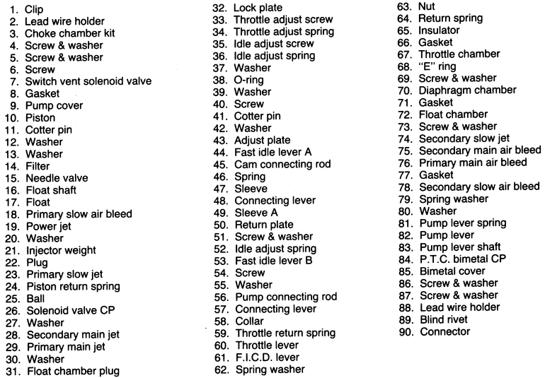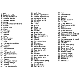 Overhaul your carburetor in a clean, dust-free area. Carefully disassemble the carburetor, referring often to the exploded views. Keep all similar and look-alike parts segregated during disassembly and cleaning to avoid accidental interchange during assembly. Make a note of all jet sizes.