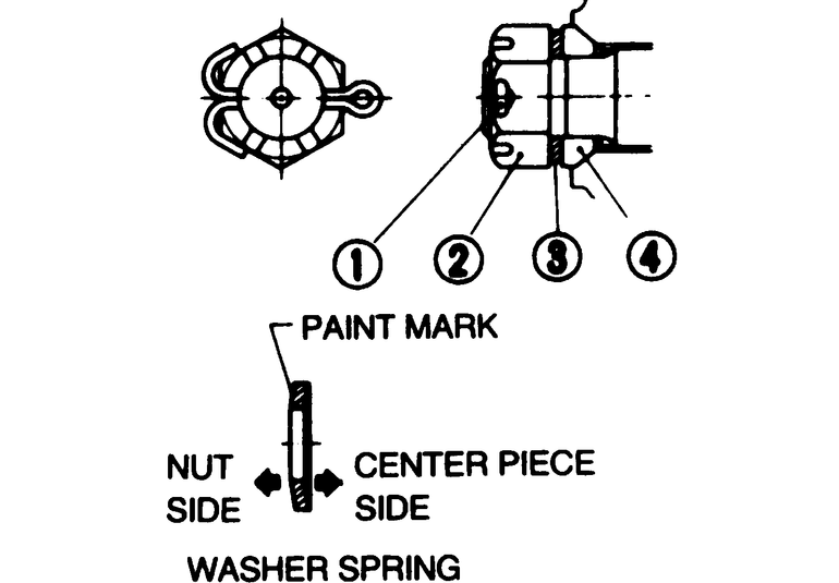 | Fig. 5: On 1980–84 4WD cars, install the cotter pin (1), castellated nut (2), spring washer (3), and spacer (4) as shown |