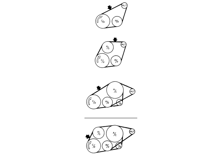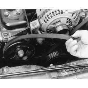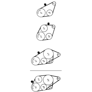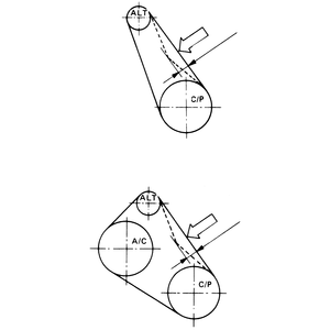 | Fig. 2: Check the belt tension on 1.8L and 2.7L engines at the appropriate arrowed area, based on the number of pulleys |