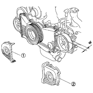 | Fig. 2: Remove the timing belt covers (1 and 2), and measure the timing belt width (W) |