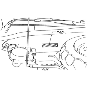 The Vehicle Identification Number (VIN) is stamped on a tab at the top left-side of the dashboard, visible through the windshield. There is also a vehicle identification plate in the engine compartment on the bulkhead.