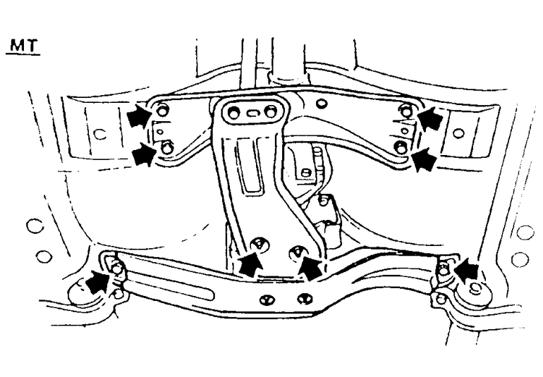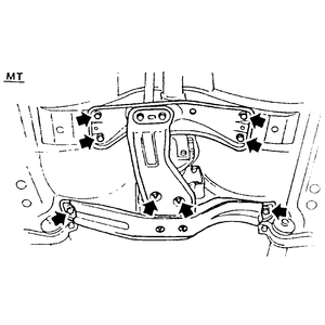 | Fig. 17: The rear transaxle crossmember is retained by the indicated fasteners |