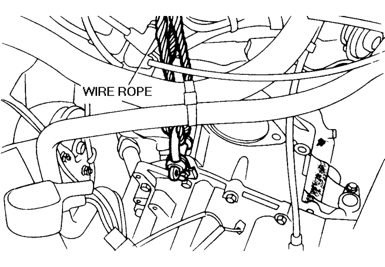 | Fig. 2: Raising the transaxle up slightly using a steel cable, engine hook and hoist |