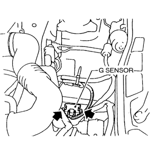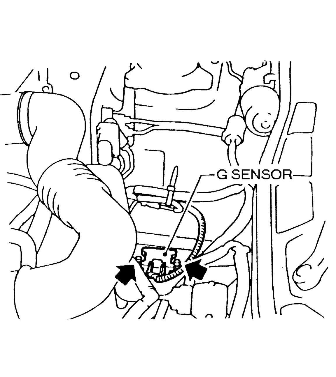 The G-sensor may be removed by unbolting it from the fender apron. Disconnect the wire harness and remove the unit. The G-sensor may be tested with an ohmmeter.