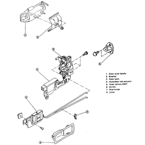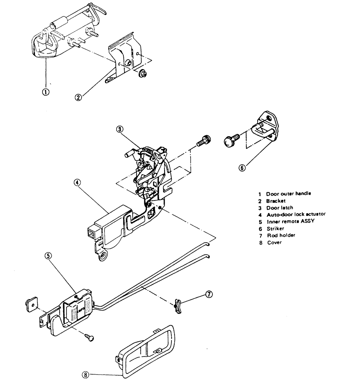 Fig. 1: Exploded view of the front power door lock assembly — Legacy shown; others similar