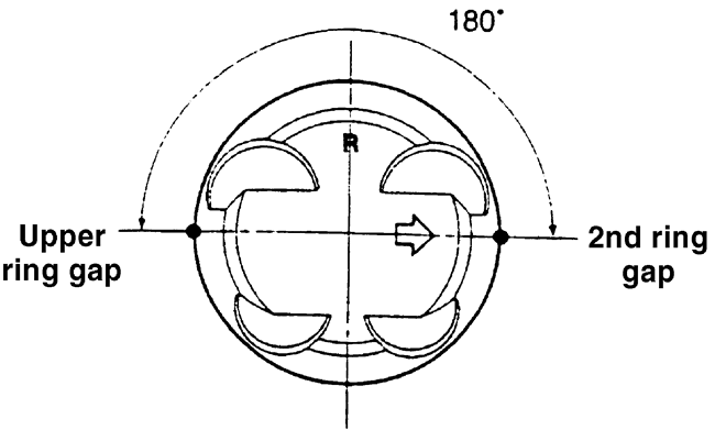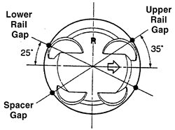 Fig. 2: Upper, spacer and lower oil ring end-gap spacing — 2.5L engine