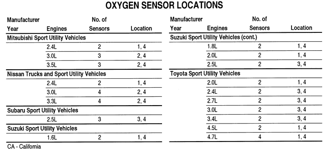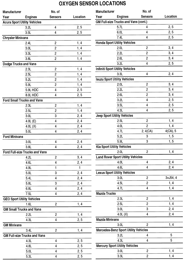 Due to mid-year production changes or factory inconsistencies, all models may not be covered. If a vehicle being serviced is not covered in the charts, inspect the exhaust system (while cold!) in the general locations to find the applicable O2sensors.