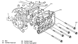 Remove bolts 1 and 3. Remove the cylinder head and gasket.