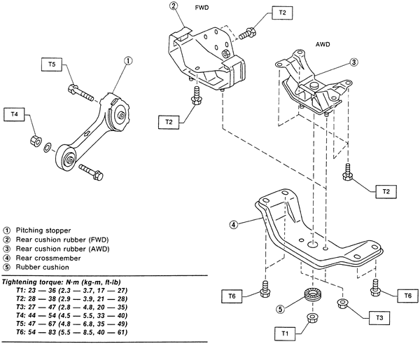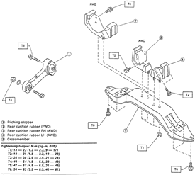 | Fig. 1: Exploded view of the transaxle mounting-Impreza models |