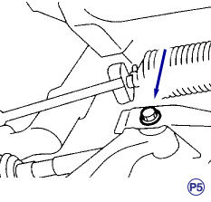 - Temporarily tighten the two bolts used to secure rear bushing of the transverse link to body.