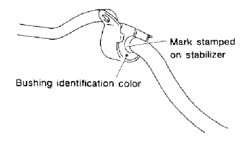 NOTE: Install bushing (on front crossmember side) while aligning it with paint mark on stabilizer. Ensure that bushing and stabilizer have the same identification colors when installing. Always tighten rubber bushing location when wheels are in full contact with the ground and vehicle is at curb weight.
