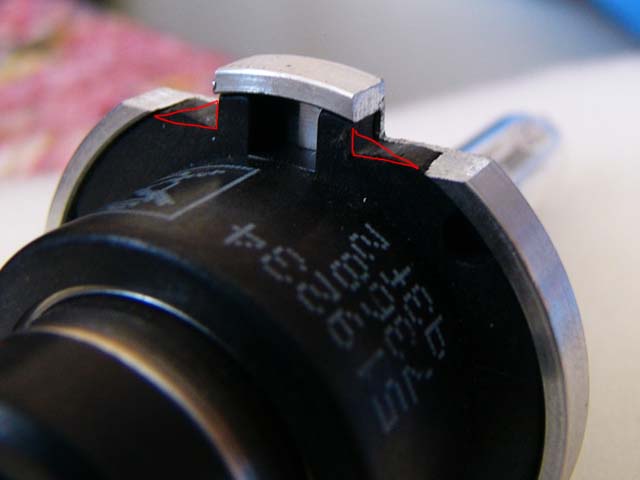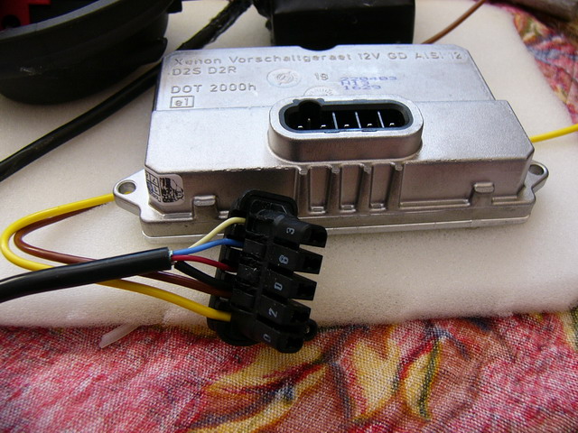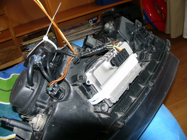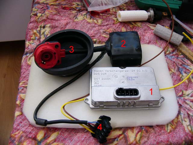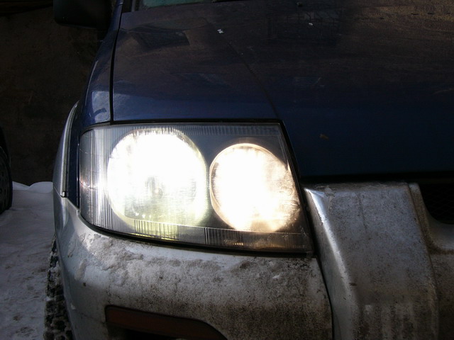 Стандартная лампа H7 крупным планом: Лампа Osram 66040 D2S 4250K, приклеена к переходнику несколькими каплями суперклея: Она же, красным показаны места где потребовалась доработка напильником: Балластный блок Hella "нового образца", 1 - собственно блок; 2 - фишка на лампу D2S(R), c встроенным высоковольтным преобразователем; 3 - фишка на лампу D2S(R) от блока Hella "старого образца", припаянная к контактам "новой" фишки; 4 - низковольтный жгут проводки. Еще раз блок крупным планом: Лампа D2S, уже стоящая в фаре и прижатая пружинкой(старая пружинка изогнута по месту): Установленная фишка. Высоковольтный провод упирается в пластик фары, в этом месте в фаре сделан небольшой вырез (1). От возможных перемещений фишка зафиксирована стяжкой(2) и куском резины(3) 19.02.2004 - резинка выкинута, т.к. мешает регулировке пучка. Фара с одетой резиновой заглушкой(входит в комплект Хеллы старого образца). Встала - как родная. 19.02.2004 - на резиновые заглушки надеты хомуты(NORMA) Фара с установленными блоком и лампой: Все разъемы изолируются от влаги силиконовым герметиком: Готовый свет на машине, справа - фара дальнего света(стандартная галогенка Stanley) 19.02.2004 - фотки светового пучка. На цветопередачу просьба не обращать внимания, в реальности цвет фар бэлый-бэлый :) ![]() ![]() 10.03.2004 - фотки светового пучка после заклеивания "лишних" секторов алюминиевой фольгой: ![]() 11.03.2004 - фотка реального освещения дороги, никакого фотошопа :) |