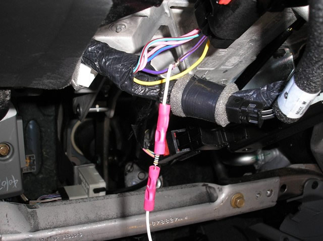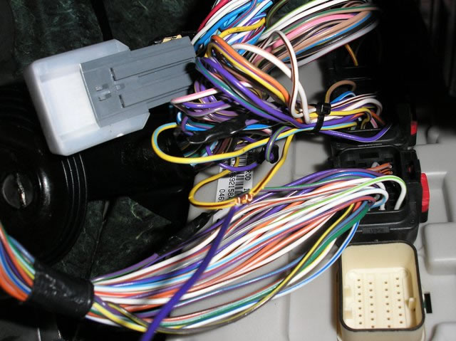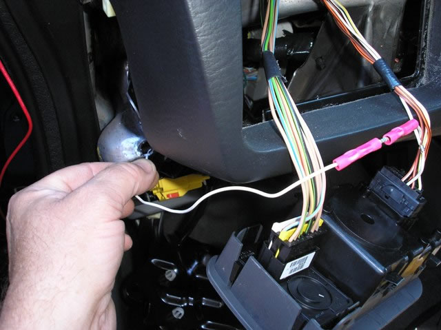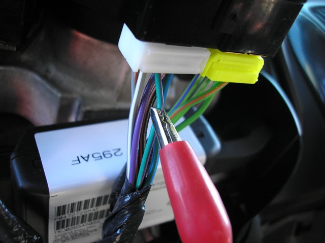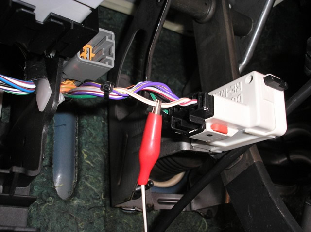 The (-) GREEN/PURPLE HORN wire, marked with the RED Clip, is located in the WHITE Plug just below the Steering Wheel and next to the YELLOW Air Bag Plug.