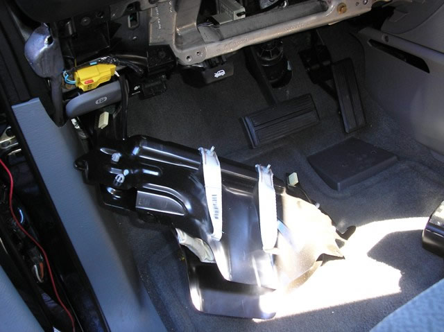 With all of the Under Dash panels removed, you can now lift up on this Knee Bolster AirBag and set it on the floor of the Vehicle, DO NOT UNPLUG the AIR BAG's YELLOW PLUG, keep the AirBag Plugged in!!!!