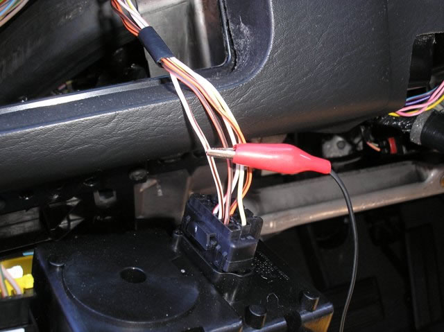 The (+) WHITE/TAN BRAKE wire, marked with the RED Clip, located at the Brake Switch under the dash.