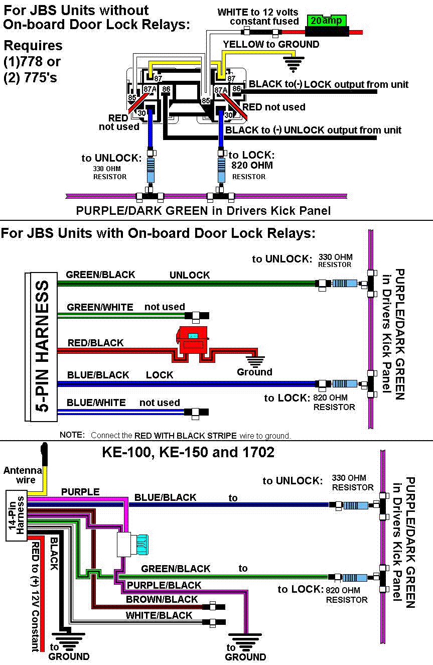 POWER LOCK PURPLE/DARK GREEN (-) SEE DIAGRAM REQUIRES 820 OHM RESISTOR SEE NOTE #4 14301_RAM-FULL-SIZE-PICKUP_DODGE RAM 1 WIRE JBS UNITS.GIF