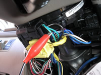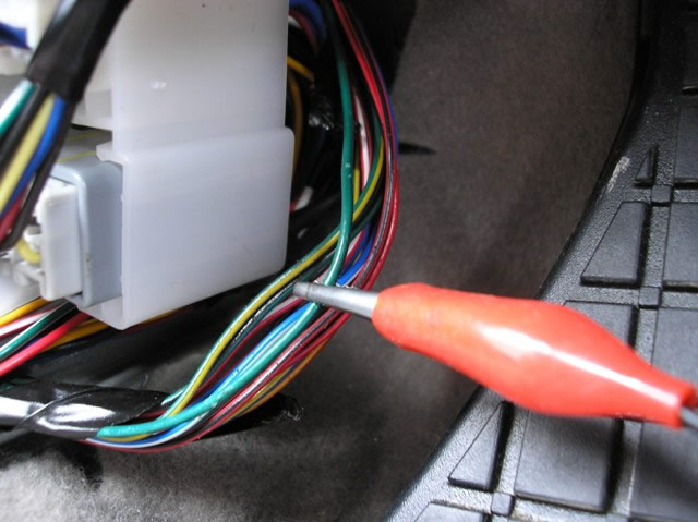 The (+) GREEN PARKING LIGHT wire, marked with the RED Clip is located in the Drivers Kick Panel. This wire is found in the Harness (wrapped with BACK Electrical tape) heading to the REAR of the Vehicle, just under the large groupe of WHITE plugs attached