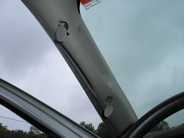 To get to the DOME LIGHT SUPERVISION wire, you will need to remove the "A" Piller or Windshield Piller cover on this vehicle. To remove this cover locate the (2) 10mm Bolt hidden behind these plugs and remove these screws, this Piller cover will then just