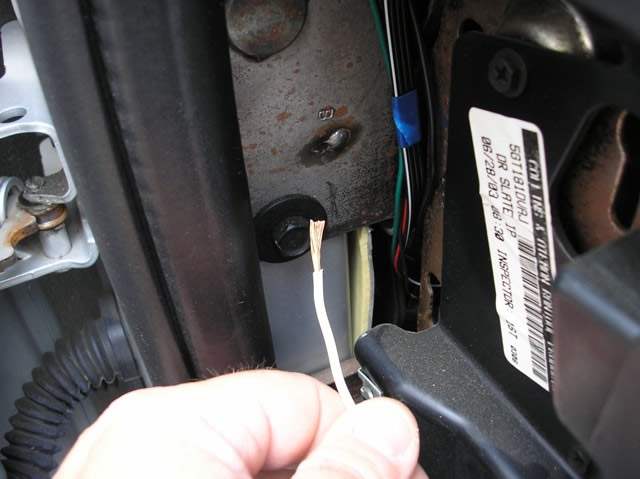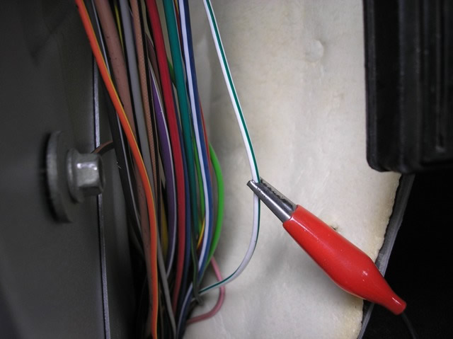 This is a picture of the (-) WHITE/GREEN DOOR LOCK/UNLOCK wire, marked with the RED Clip. This wire is located in the Drivers Door Harness in the Drivers Kick Panel.