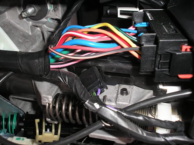 This picture shows the Under Dash Panel removed, this exposes the under dash wiring and the Ignition Switch Harness as it exits the Steering Column of the vehicle. The Ignition Switch Harness in this picture is the Large Harness with the Heavy gauge wires