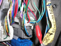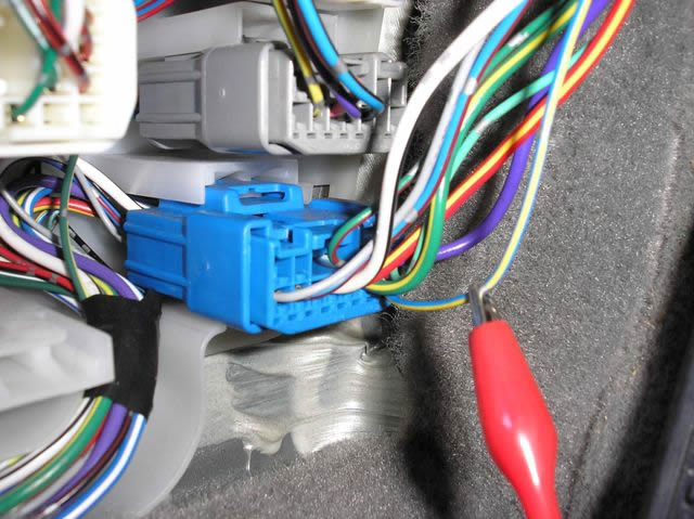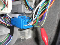 The TYPE "B" BLUE/YELLOW LOCK wire, marked with the RED Clip, is located in the BLUE Plug that is attached to the kick panel in this vehicle.