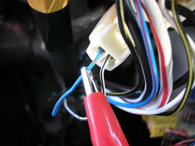 The (-) BLUE KEY SENSE wire, marked with the RED Clip, is located in a 2-Pin WHITE Plug just behind the WHITE Ignition Switch Harness Plug on the column.