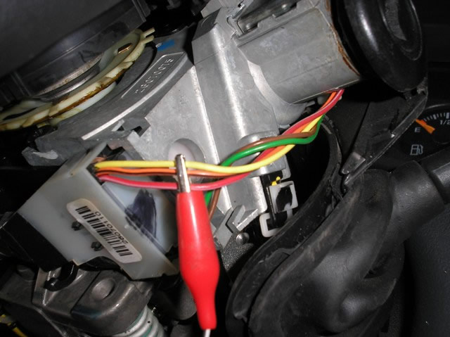 This picture shows the (3) PASSLOCK II wires (marked with the RED Clip) as they exit the IGNITION SWITCH TUMBLER. Of these (3) wires, the RED/WHITE wire is NOT USED!!. The YELLOW is the (+) PASSLOCK signal wire or the wire that shows 1 to 6 volts DC on a