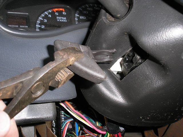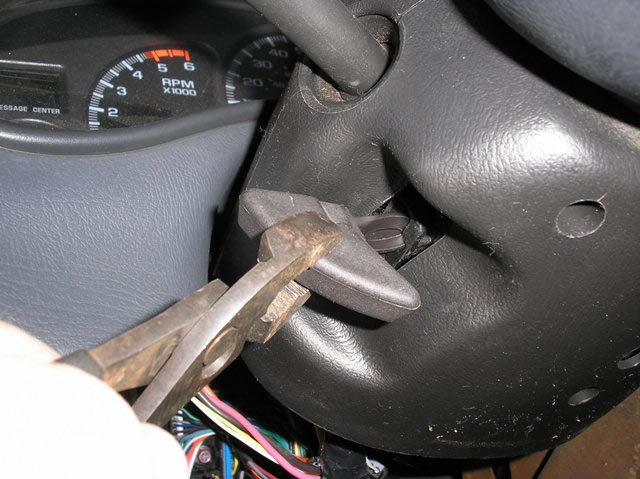 To remove the Lower Column cover, you will need to remove the Tilt Wheel Lever, use a pair of plyers to grab ahold of the Lever, so that is does not get mared, place a piece of cloth in the jaws of the plyers.