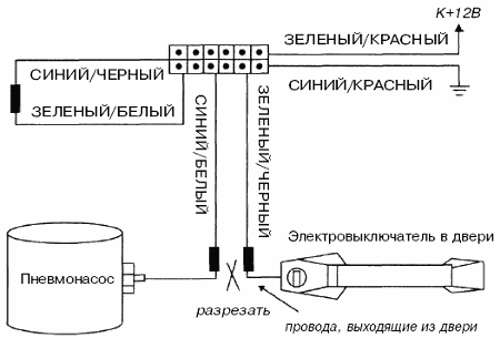 Примечание: В автомобилях выпуска 1989 г. (или ранее) пневмонасос работает около 3 секунд. При установке системы на такие автомобили необходимо будет также запрограммировать длительность импульса, подаваемого на замки дверей, на 3.5 секунды (программируемая функция № 16).