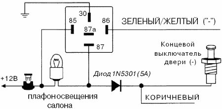Подсоединение: Подсоедините ЗЕЛЕНЫЙ/ЖЕЛТЫЙ провод к клемме № 86 дополнительного 30 А реле и подсоедините клемму № 85 реле к +12В через предохранитель. Подсоедините остальные контакты реле в соответствии с полярностью цепи внутрисалонного освещения автомобиля как показано на схемах.