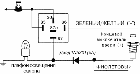 ВНИМАНИЕ: Обязательно используйте диод для изолирования цепи управления внутрисалонным освещением от цепи триггера двери. В противном случае не сможет правильно работать функция пассивной постановки на охрану и функция автоматической повторной постановки системы в режим охраны.