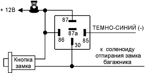 ВНИМАНИЕ: Подсоединение ТЕМНО-СИНЕГО провода непосредственно к сильноточным цепям замка багажника или к некоторым устройствам дистанционного запуска двигателя приведет к повреждению основного блока системы.