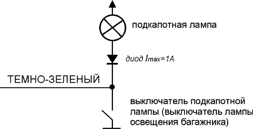 - . Рекомендуемая схема подключения ТЕМНО-ЗЕЛЕНОГО провода системы ("отрицательный триггер капота/багажника") к подкапотной лампе автомобилей ВАЗ семейств 2109, 2115, 2123 или лампе освещения багажника автомобилей ВАЗ семейства 2115: