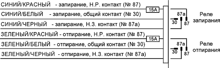 Схема 1. 3-проводная система центрального замка, управляемая сигналом отрицательной полярности (большинство автомобилей японского производства)