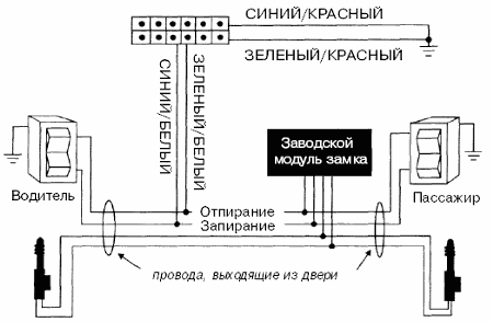 Схема 1. 3-проводная система центрального замка, управляемая сигналом отрицательной полярности (большинство автомобилей японского производства)