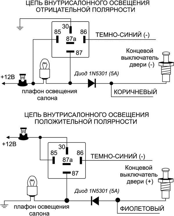 Подсоединение: Подсоедините ТЕМНО-СИНИЙ провод к контакту № 86 дополнительного 30А реле и подсоедините контакт № 85 реле к +12В через предохранитель. Подсоедините остальные контакты реле в соответствии с полярностью цепи внутрисалонного освещения автомобиля как показано на схемах.
